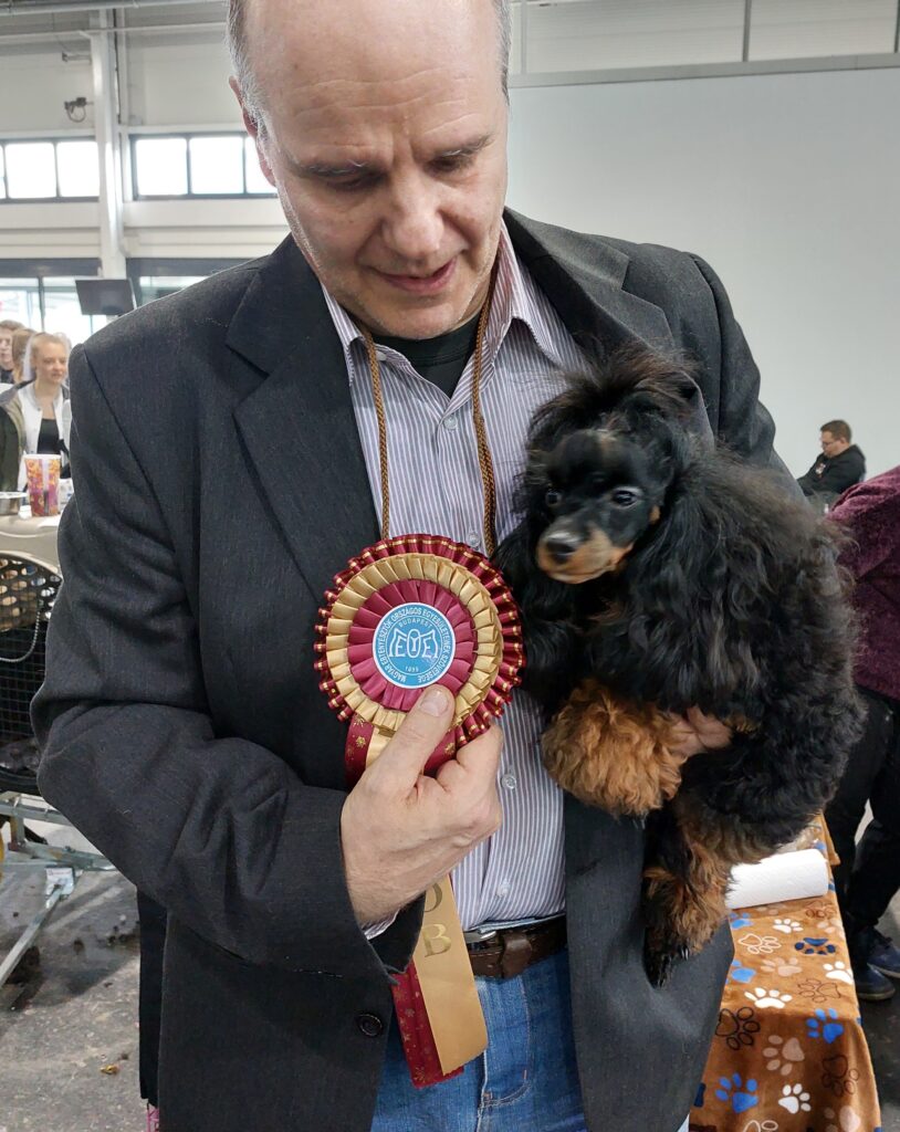 2021-ben léptünk egy nagyot. Azt mondtuk, hogy nem baj, hogy az FCI még nem fogadja el a színes uszkárokat, csak CPPF, azaz Chien Pluricolor á Poil Frisé néven, mi akkor is belevágunk. Hiszen a színes uszkárok mindig is a szívem csücskei voltak. Így érkezett meg hozzánk az első többszínű uszkárunk Renée, aki black and fawn színű, mint egy kis dobermann 😀
